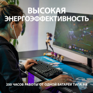 Благодаря датчику HERO и технологии беспроводной связи LIGHTSPEED у игроков появилась возможность месяцами наслаждаться любимыми играми без замены батареи. Время работы до полной разрядки достигает 250 часов при использовании всего одной батареи типа АА. Мышь можно настроить таким образом, чтобы в экономичном режиме она могла работать без замены батареи до 9 месяцев. Для этого необходимо ПО Logitech Gaming Software. Проверено на коврике для игровой мыши Logitech G240 Когда уровень заряда батареи мыши G305 снизится до 15 %, вы узнаете об этом благодаря световому индикатору и приложению Logitech Gaming Software.