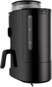 Корпус выполнен из глянцевого высококачественного пластика черного цвета с металлическими вставками. Небольшой жаропрочный кофейник объемом 0,75 л с ручкой из теплостойкого пластика рассчитан на 6 чашек. Резервуар для воды емкостью 0,83 л оснащен мерной шкалой.