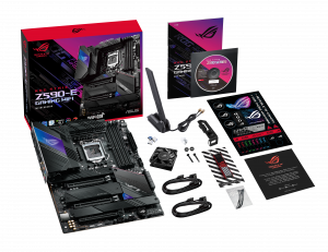 Материнская плата с чипсетом Intel Z590: процессорный разъем LGA 1200, форм-фактор ATX, PCIe 4.0, 16 (14+2) спаренных силовых модулей, системы интеллектуального шумоподавления, разгона, охлаждения и сетевого подключения, Wi-Fi 6E, два порта 2.5G Ethernet (контроллеры Intel), четыре слота M.2 с радиаторами, USB 3.2 Gen2, SATA, синхронизируемая подсветка Aura