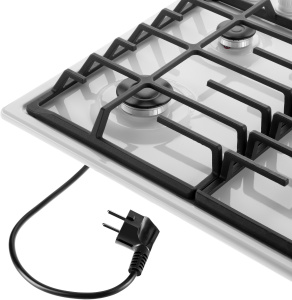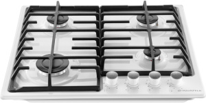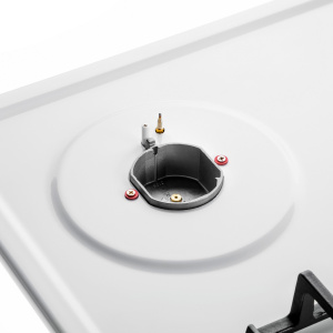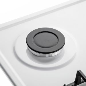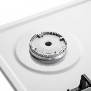 Панель выполнена из металла, покрытого термостойкой прочной эмалью белого цвета. Четыре стандартные итальянские конфорки SABAF мощностью 1000 Вт, 1700 Вт, 1700 Вт и 2600 Вт спроектированы таким образом, что огонь не перегревает ни чугунные решетки, ни ручки управления.