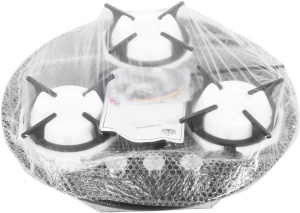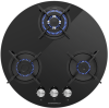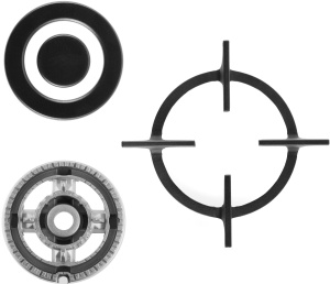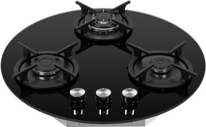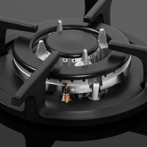 Панель выполнена из закаленного стекла черного цвета. В данной модели установлены высококачественные итальянские горелки SABAF. Две стандартные конфорки мощностью 1000 Вт и 1700 Вт и одна мощная WOK-конфорка с двойным пламенем мощностью 3000 Вт. Укомплектованы круглыми чугунными решетками.