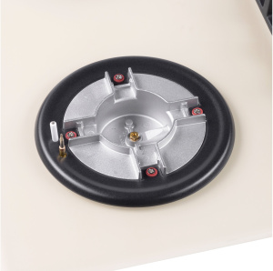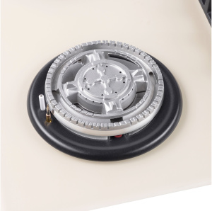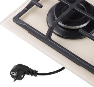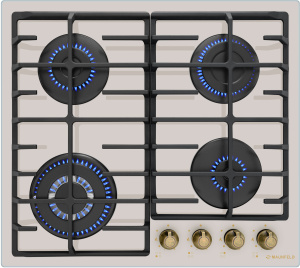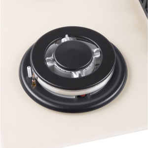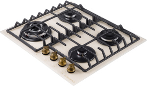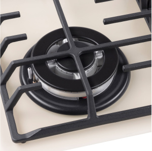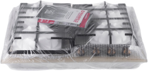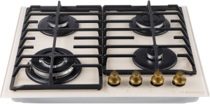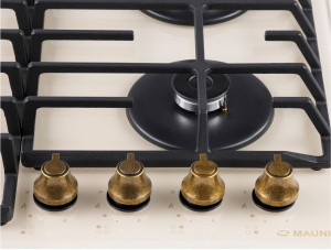 Панель выполнена из закаленного стекла, устойчивого к царапинам, сколам и постоянным перепадам температур. В данной модели установлены высококачественные итальянские горелки SABAF. Три стандартные конфорки мощностью 1000 Вт, 1700 Вт, 1700 Вт и одна сверхмощная WOK-конфорка с двойным пламенем мощностью 3800 Вт спроектированы таким образом, что огонь не перегревает ни чугунные решетки, ни ручки управления.