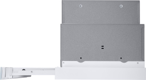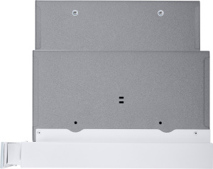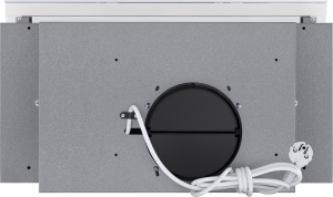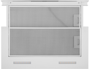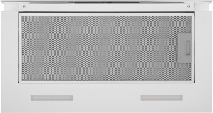 Фасад выдвижной панели выполнен из закаленного глянцевого стекла белого цвета. Основная рабочая и выдвижная панели изготовлены из нержавеющей стали с эмалированным белым покрытием. Установлено два жироулавливающих фильтра из алюминия. Корпус сделан из нержавеющей стали.