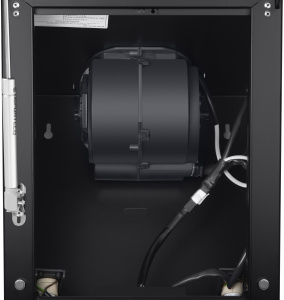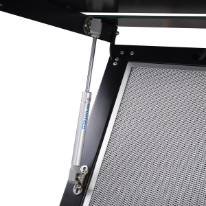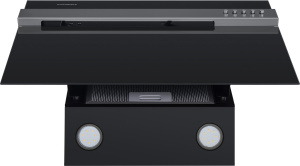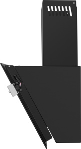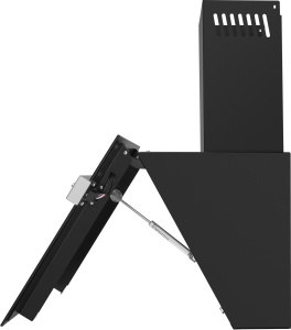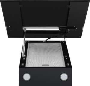 Корпус выполнен из нержавеющей стали. Откидной фасад из закаленного стекла черного цвета с металлической вставкой оснащен пневматической системой газ-лифт, позволяющей надежно фиксировать дверцу в открытом состоянии. За фасадом находится многослойный жироулавливающий фильтр, который легко вынимается и полностью разбирается, что сильно упрощает его чистку.