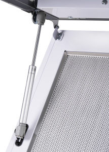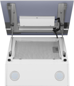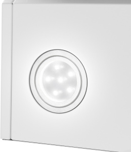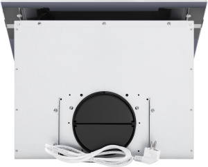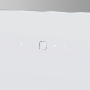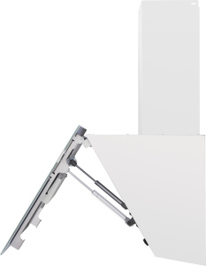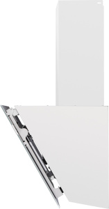 Корпус сделан из нержавеющей стали. Откидная панель выполнена из глянцевого закаленного белого стекла с матированной металлической вставкой и оснащена магнитными фиксаторами и газовыми амортизаторами. За ней скрывается легко снимающийся алюминиевый жироулавливающий фильтр. Загрязненный воздух втягивается по периметру откидной панели.