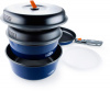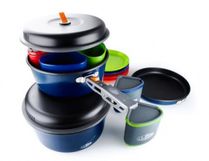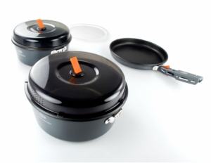 Включает в себя все самое необходимое для приготовления и употребления пищи в полевых условиях.Кастрюли и сковородка имеют антипригарное покрытие Teflon. Крышка из жаропрочного нейлона обладает специальными отверстиями для слива воды. Эксклюзивная складная ручка фиксируется внешними зажимами для предотвращения царапин, а также выступает в роли надежного захвата во время приготовления пищи.Входящий в комплект удобный чехол с проклеенными швами можно использовать как емкость для мытья посуды.Прочная разделочная доска с выпуклой и плоской сторонами в комплекте.