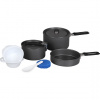 Плотно прилегающие крышки кастрюль (на 800 и 1000 мл) с отверстиями для выхода пара ускоряют процесс приготовления пищи и оберегают еду от мусора и насекомых. Складывающиеся, отделанные пластмассой ручки кастрюль и сковородки (∅178 мм, h=43 мм) не обжигают руки и позволяют компактно упаковать набор после использования.