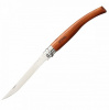 Нож Опинель №12 представляет собою филейную модель с длинным и узким лезвием. Кроме того, лезвие довольно неплохо гнется, благодаря чему нож удобно использоваться для отделения от костей филе рыбы. Подойдет он и для мяса или сыра, а вот более твердые продукты таким ножом лучше не резать, чтобы не повредить клинок. Длина лезвия Опинель №12 составляет 120 мм. С учетом же рукоятки, размер ножа достигает 270 мм. Однако его удобно хранить не только дома на кухне, но и брать с собою в любые поездки. Дело в том, что этот нож – складной.