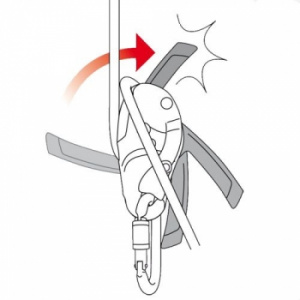 - Защелка-предохранитель на подвижной боковой пластине помогает предотвратить случайное выстегивание устройства и облегчает установку устройства на веревку и прохождение промежуточных точек страховки
