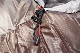 - Пластиковый крючок фиксирует шнуры затяжек с внешней стороны спальника