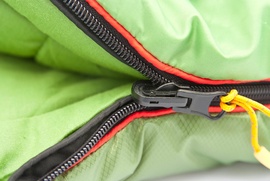 Если расстегнуть спальник в одеяло, то шнуры затяжки будут как раз посередине верхнего края и обязательно лягут вам на лицо во время сна. Это произойдет на любых спальниках, кроме Alexika, так как на Siberia затяжка смещена от края на 7-8 см и зафиксирована пластиковым крючочком. Сами шнуры двух видов, со стороны груди шнур круглый, а со стороны спины плоский. Это позволит в темноте на ощупь выбрать нужную затяжку. Молния на кемпинговом спальном мешке крупная (8 размера) и прочная. Вдоль молнии идет плотный рант, чтобы замок не закусывал ткань. Два замка позволяют открывать вентиляционное окно на уровне стоп. Если расстегнуть спальный мешок в одеяло и положить на него такой же спальный мешок одеяло, то их можно состегнуть по периметру и получить двухспальный мешок. На замках молнии надета петелька, которая удобно прихватывается пальцем и светится в темноте. Представьте, как это важно, когда вам в полной темноте надо расстегнуть спальник. Хотя замки молнии имеют самоблокировку, в верхней части молнии есть клапан с липучкой Velcro. Внутри спального мешка расположен большой карман из мягкой сетки для носового платка и разных мелочей. Сетка позволяет видеть, что внутри кармана, и не забыть свои вещи.