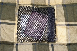 Большой сетчаты кармашек для носового платка и всяких мелочей. Через сетку сразу видно, что лежит внутри.
